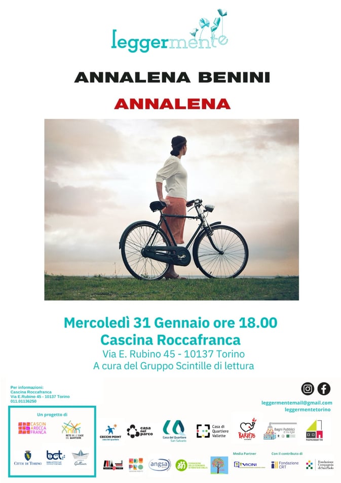 Mercoledì 31 gennaio ore 18, nell'ambito del progetto Leggermente 2023-2024, incontro di presentazione del romanzo "Annalena" di Annalena Benini. A cura del gruppo lettura Scintille di Lettura. Presso Cascina Roccafranca, via Rubino 45.