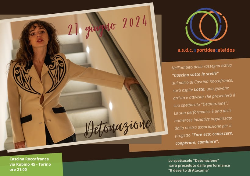 Il 27 giugno alle ore 21 nell'ambito della rassegna estiva "Cascina sotto le stelle", sul palco di Cascina Roccafranca, sarà ospite della nostra associazione Lotta, una giovane artista e attivista che presenterà il suo spettacolo "Detonazione".