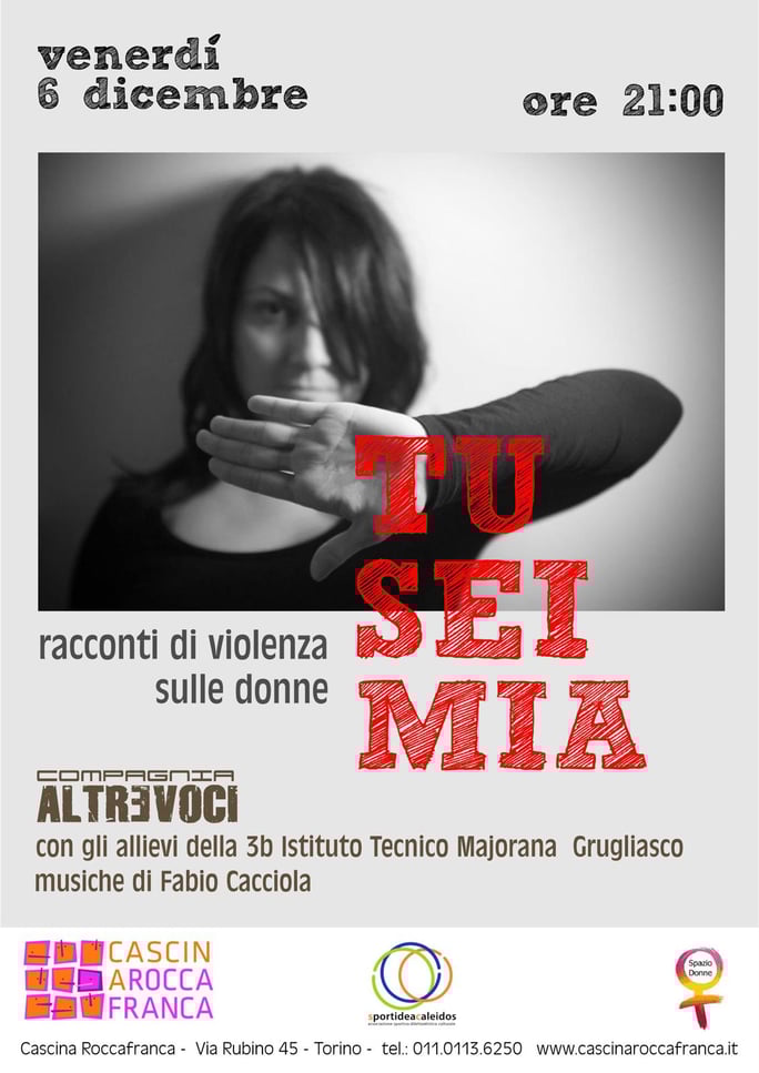 Venerdì 06 dicembre ore 21 in Cascina Roccafranca si terrà lo spettacolo Tu sei mia... Racconti di violenza sulle donne: un viaggio nei meandri del non detto e dell’offesa. Voci recitanti i ragazzi della 3b dell’Istituto Tecnico Majorana di Grugliasco.
