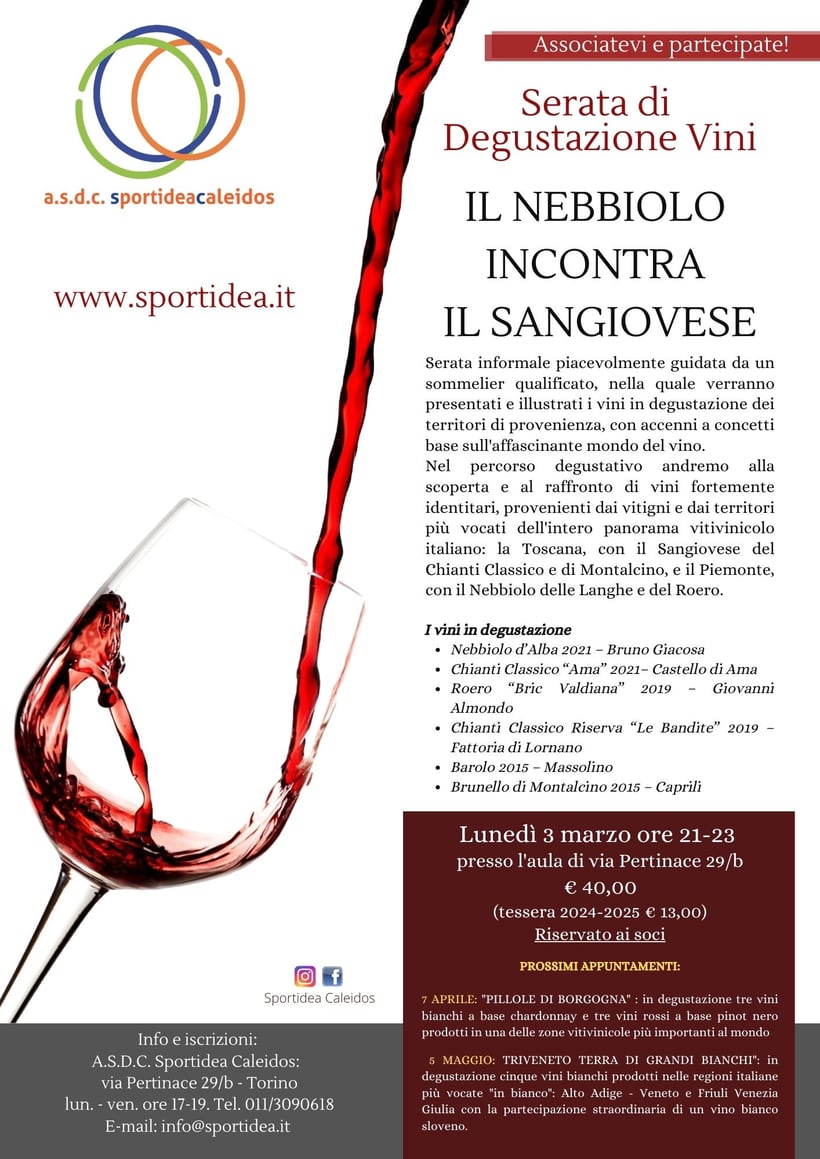 Serata informale piacevolmente guidata da un sommelier qualificato, nella quale verranno presentati e illustrati i vini in degustazione dei territori di provenienza, con accenni a concetti base sull'affascinante mondo del vino.